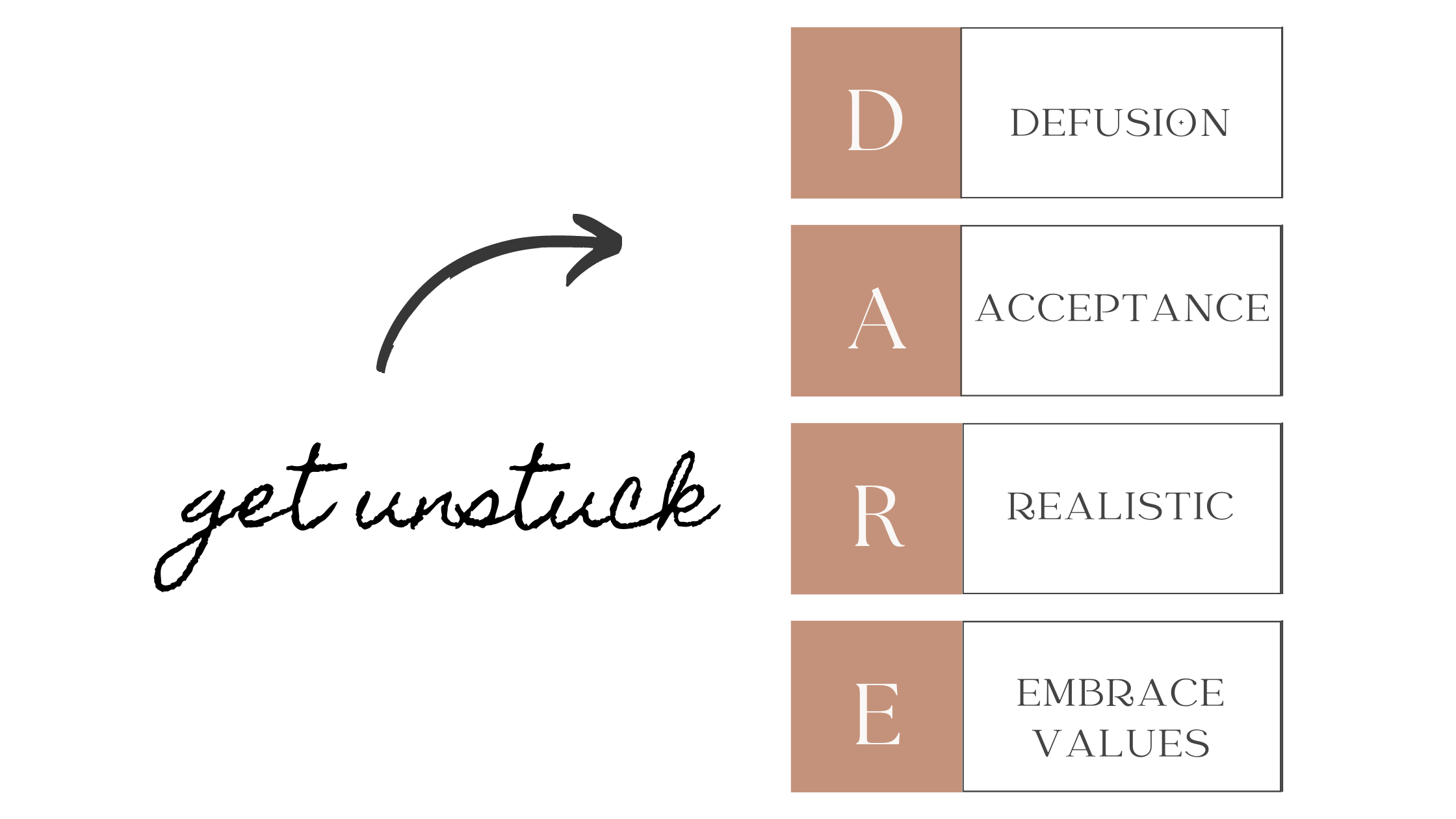 Here’s one from psychologist Russ Harris (Harris & PhD, 2019). It breaks down the four things that generally keep us stuck in our goal attempts.